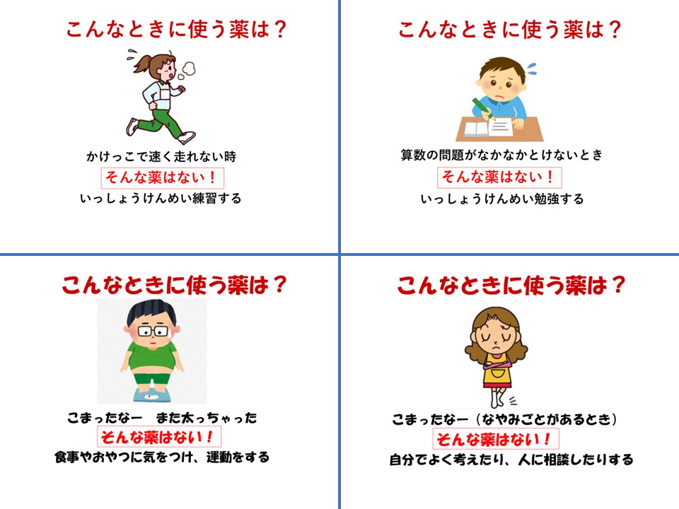 この教材は、「こんな時に使う薬は?」と対比して使用することにより、薬物の誘いに対する判断力「変だなと感じる力」を培うことができると考えます。