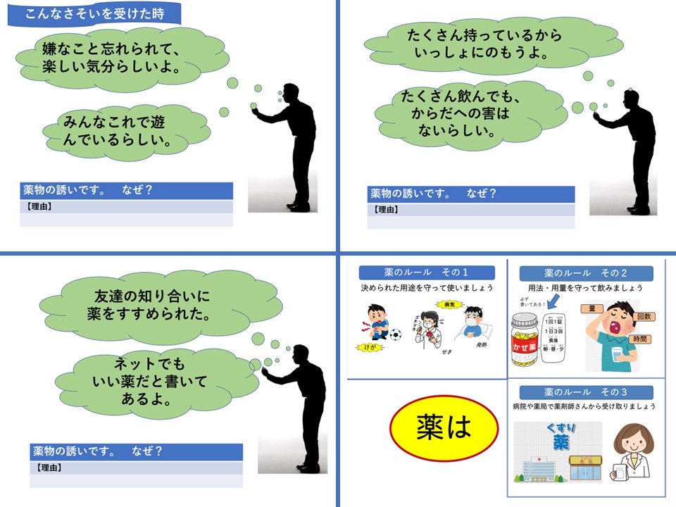 薬物の誘いが、薬の決められた用途と異なること、知らない人、先輩、友人からこっそり行われることが多いことなどから、自分で判断する能力「変だな?」を高める指導を目指します。