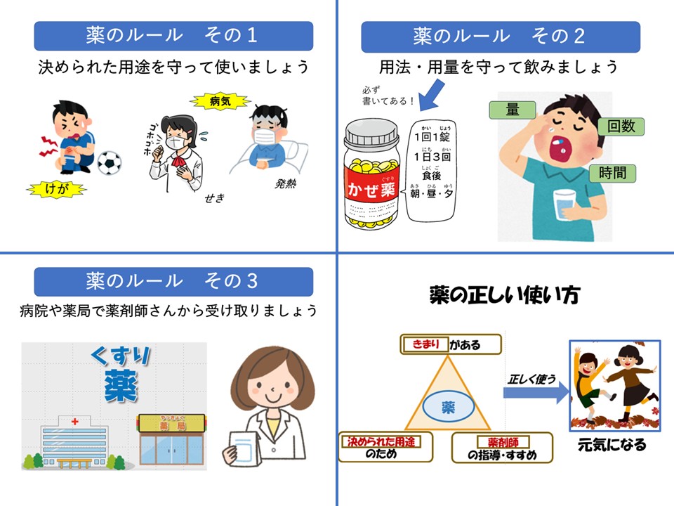薬の知識、「薬は決められた用途を守って使うもので、用法・用量などの決まりがあること、専門家(薬剤師)から指導を受けてもらうもの。」を伝えます。「薬の知識」参照)