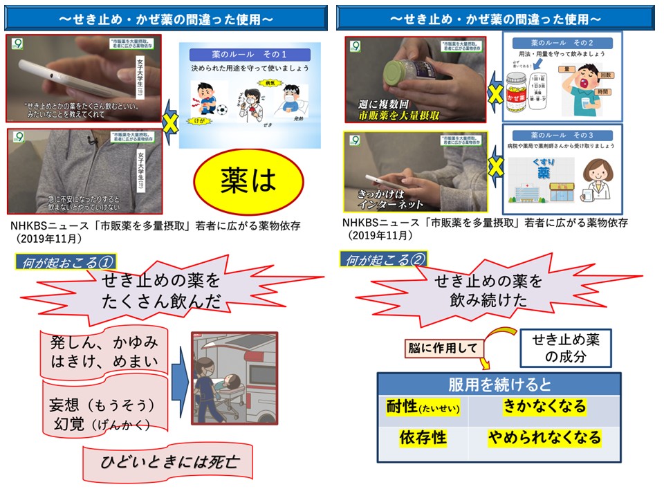 さらに健康被害について、急性毒性と乱用を続けて起こる健康被害を取り上げました。薬の乱用は、すぐに影響が現れるだけでなく、続けているうちに健康に悪い影響が起きて、気が付いた時には取りかえしがつかなくなってしまうことがあることを伝えます。
