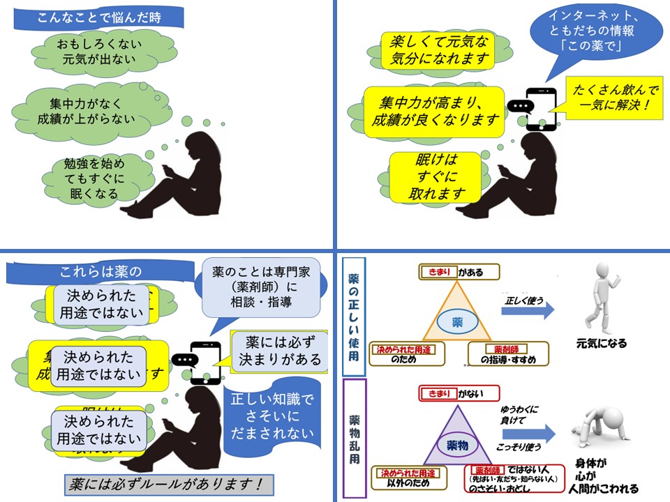 薬物は、今よりいいことができる(決められていない用途(効果))と、知らない人、先輩、友人(専門家:薬剤師でない)から、こっそり(規則がない)誘われることを理解し、自分で判断する能力「変だな?」を高めるように指導を行います。